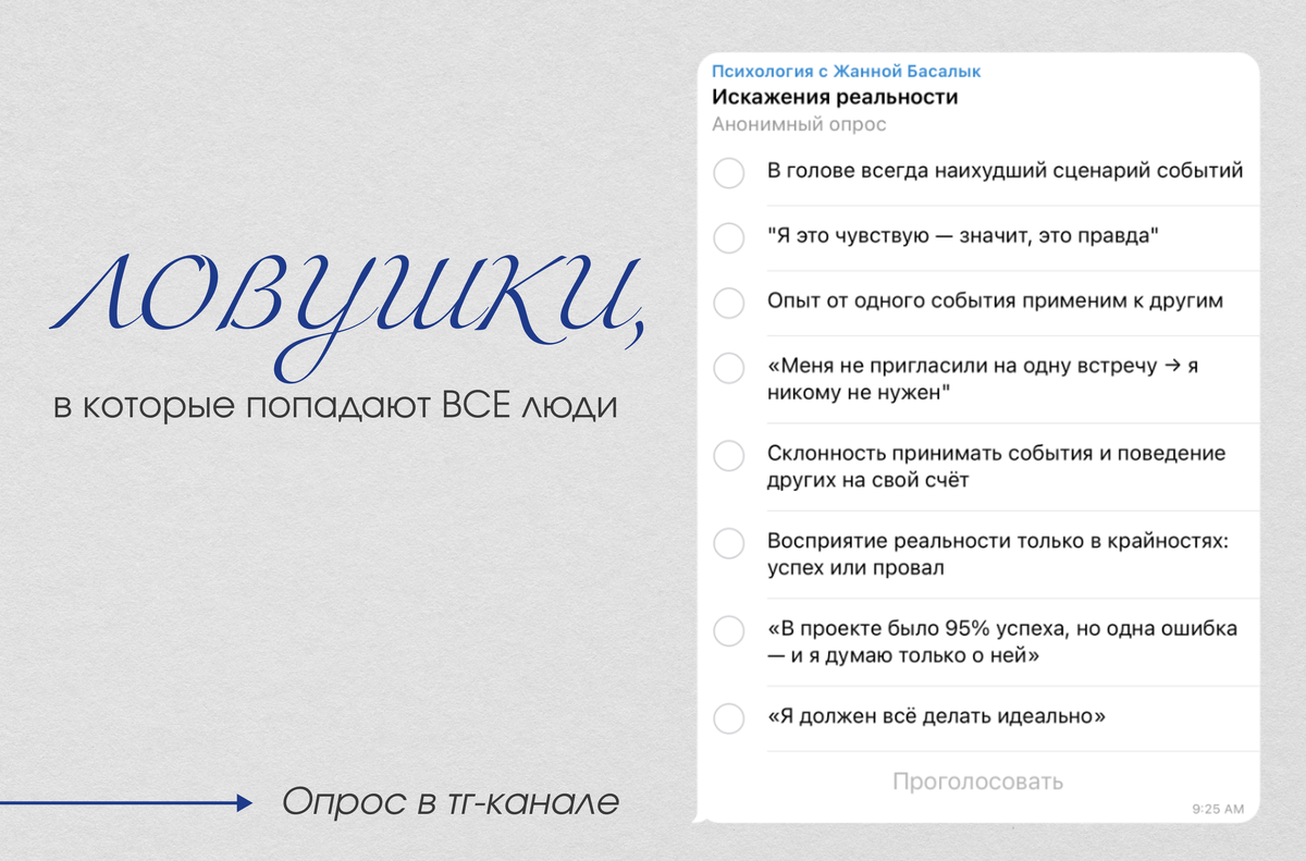 Ваш мозг экономит энергию и постоянно вас обманывает. Узнайте, как распознать эти хитрые уловки — и начать думать яснее! Преувеличение масштабов проблемы до вселенской трагедии. Пример: «Опоздал на встречу → карьера рухнула → останусь без денег». Спасение: Спросите: «Что скажет об этом посторонний человек? Каков реальный масштаб?» Видеть только крайности — либо идеально, либо ужасно. Пример: «Не сбросил 10 кг за месяц → диета не работает → бросаю!». Спасение: Ищите оттенки серого. «Да, результат скромный, но я стал чувствовать себя лучше». Уверенность, что вы знаете, что думают другие. Пример: «Она на меня не посмотрела — точно злится!» (хотя у неё просто болела голова). Спасение: Спросите: «Какие есть доказательства? Я действительно могу это знать?» Тирания слов «должен» и «надо». Пример: «Я должен быть идеальным родителем!» → хроническая вина и выгорание. Спасение: Замените «должен» на «хочу» или «выбираю». «Я это чувствую — значит, это правда». Пример: «Чувствую себя неудачником → з