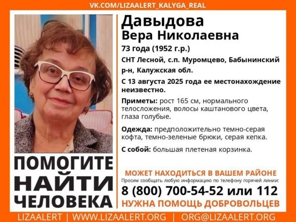 73-летняя Вера Давыдова ушла из своего дачного дома в селе Муромцево Бабынинского района ещё 13 августа, и с тех пор о ней ничего не известно, напомнили в официальной группе поискового отряда «ЛизаАлерт Калужской области». Но теперь появились новые данные – стало известно, во что была одета пенсионерка. И судя по тому, что при ней была большая плетёная корзина, жительница Калуги могла уйти в лес за грибами. Как предполагают в поисковом отряде, женщина была одета в тёмно-серую кофту, тёмно-зелёные брюки и серую кепку. Ранее сообщалось, что к поиску пропавшей подключились сотрудники Следственного комитета и МЧС, полицейские и военнослужащие. Была задействована спецтехника, в том числе вертолёт и дроны. По факту безвестного исчезновения калужанки в региональном СУ СКР возбудили уголовное дело по статье «Убийство». Всех, кто видел разыскиваемую или знает о её местонахождении, просят сообщить по телефонам: 8 800 700-54-52, 8 (920) 895-48-02 или 112. Поисковый отряд «ЛизаАлерт» Калужской обл
