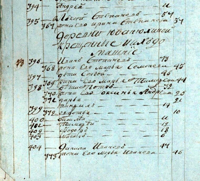 Государственный исторический архив Чувашской Республики. Фонд № 225, Опись № 7, дело № 22. Стр. 2145 скан. Роспись Казанской губернии ведомства Чебоксарского духовного Правления Цывильского уезда села Шигалей Воскресенской церкви священника Фёдора Ионова с причетники обретающимся при оной их церкви в приходе ниже явленных чинов людям, со изъявлением против коегожда имени о бытии их во Святую Четырёхдесятницу у исповеди и Святого Причастия, и кто исповедывался токмо, не причастился, и кто ж не исповедывался сего 1801 года. Стр 2160 скан. Деревни Юванюхиной крещёные и их домашние. 58. Иван Степанов. 73. Жена ево Марья Семёнова. 45. Дети Сергей. 46. Жена ево Марья Тимофеева. 44. Дети Петр. 32. Жена ево Оксинья Андреева. 26. Дарья. 21. Панфил. 14. Овдотья. 10. Василей.11. Тимофей.12. Фёдор. 18. Макар. 6. Данила Иванов. 47. Жена ево Марья Иванова. 46. Дети Василей. 32. Жена ево Устинья Герасимова. 26. Афанасей. 26. Жена ево Марфа Прокофьева. 26. Иван. 14. Онисья. 19. Федосья. 19. Дарья. 11