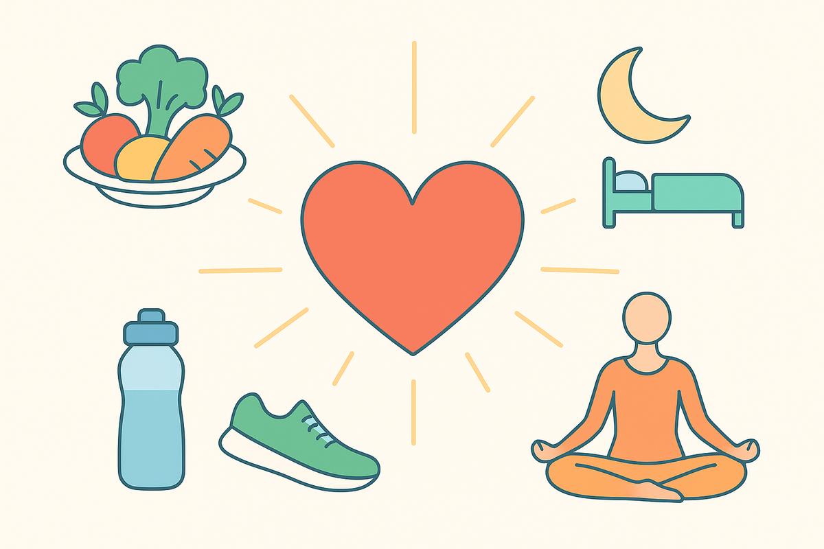 Сердце — один из самых важных органов, но мы часто вспоминаем о нём только тогда, когда появляются проблемы. К счастью, есть простые шаги, которые помогут сохранить здоровье сердца и сосудов уже с сегодняшнего дня. 1. Двигайтесь каждый час Даже лёгкая активность — прогулка, разминка или несколько приседаний — улучшает кровообращение. Сидячий образ жизни повышает риск сердечно-сосудистых заболеваний. 2. Обратите внимание на питание - Уменьшите соль и сахар. - Добавьте овощи, фрукты, цельные злаки и белок. - Полезные жиры (рыба, орехи, оливковое масло) поддерживают сосуды. Совет: попробуйте заменить один сладкий напиток водой или зелёным чаем прямо сегодня. 3. Сон не менее 7–8 часов Хроническое недосыпание повышает давление и стрессовые гормоны, а это вредно для сердца. 4. Контроль стресса Медитация, дыхательные упражнения, прогулки на свежем воздухе — всё это снижает нагрузку на сердце. Даже 5 минут спокойного дыхания несколько раз в день помогают. 5. Откажитесь от курения Даже одна сиг