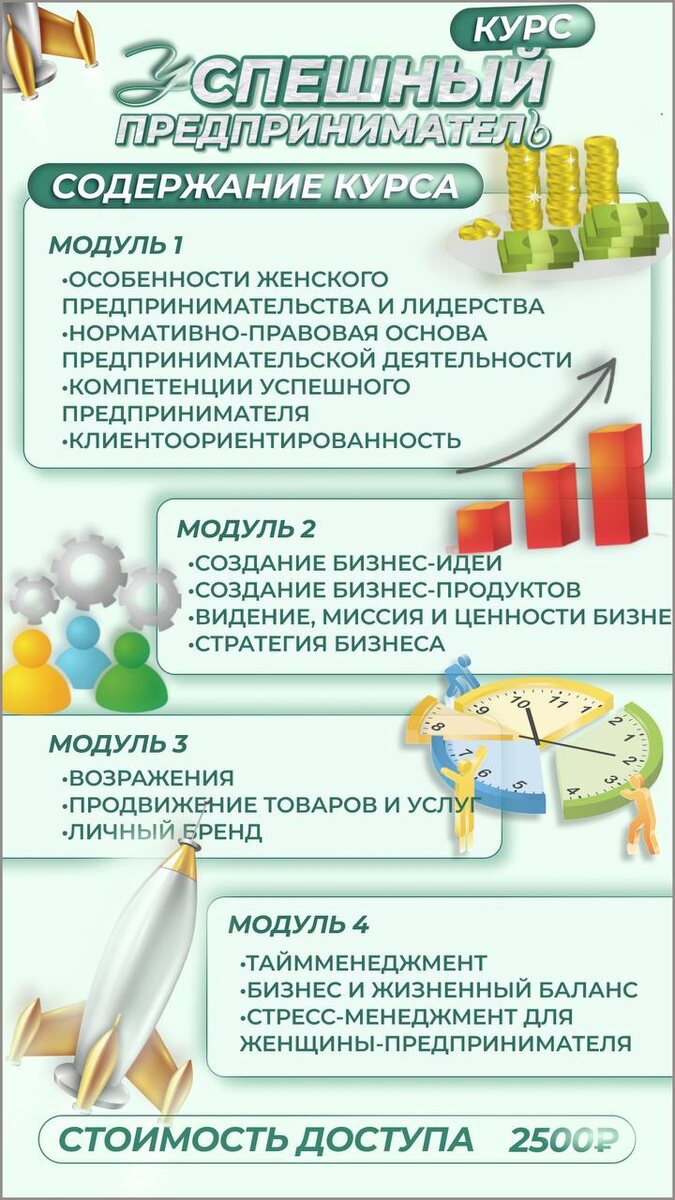 Всем привет! Сегодня у меня для Вас сюрприз. Хочу рассказать Вам об одном курсе, который поможет начинающим предпринимателям понять для чего они пошли в предприниматели. Курс Успешный предприниматель Правила перепродажи курса Вводный урок. Знакомство с экспертом Урок 1. Особенности женского предпринимательства и лидерства Урок 2. Нормативно-правовая основа предпринимательской деятельности Урок 3. Компетенции успешного предпринимателя Урок 4. Клиентоориентированность Урок 5. Создание бизнес-идеи Урок 6. Создание бизнес-продуктов Урок 7. Видение, миссия и ценности бизнеса Урок 8. Стратегия бизнеса Урок 9. Возражения Урок 10. Продвижение товаров и услуг Урок 11. Личный бренд Урок 12. Таймменеджмент Урок 13. Бизнес и жизненный баланс Урок 14. Стресс-менеджмент для женщины-предпринимателя Этот курс как раз и помогает начинающим предпринимателям понять всю суть предпринимательства. Как вы считаете будете ли вы советовать этот курс своим друзьям и знакомым? Свои ответы пиши
