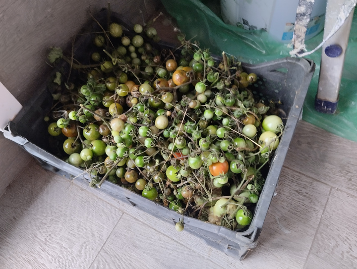В выходной день я собрала ящик зелёных помидор, потому что мои помидорные посадки стала поражать фитофтора, пришлось удалить все кусты и сжечь их.