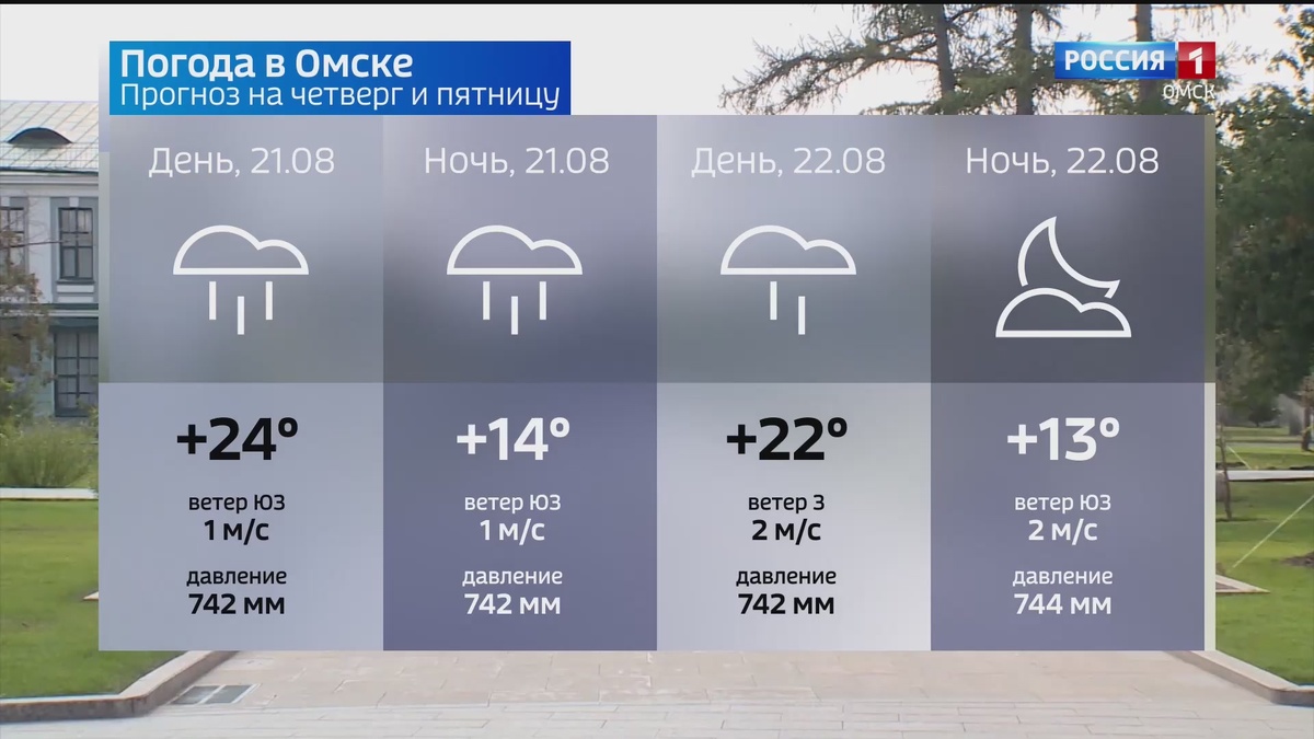 Сегодня дождливо, днём температура воздуха поднимется до +24°C, юго-западный ветер будет дуть со скоростью 1 метр в секунду. Ночью столбики термометров опустятся до +14°C. В пятницу, 22 августа, прогнозируют дождь. Днём будет до +22°C, западный ветер, его скорость — 2 метра в секунду. Ночью температура снизится до +13°C.