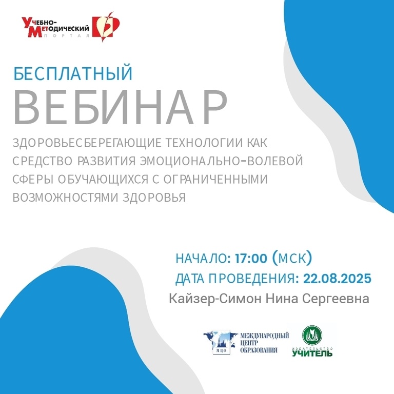 Вебинар «Здоровьесберегающие технологии как средство развития эмоционально-волевой сферы обучающихся с ограниченными возможностями здоровья» Дата проведения: 22.08.2025 Начало: 17:00 (МСК) https://www.uchmet.ru/events/item/3895851/ Возраст является определяющим в формировании основы физического и психического здоровья, когда закладываются основные черты личности, формируется характер и мировоззрение. Этот этап является основополагающим для развития у обучающихся практических навыков здорового образа жизни, занятия спортом и физической культурой. Существуют разнообразные формы и виды деятельности, направленные на сохранение и укрепление здоровья обучающихся, который в настоящее время называется «здоровьесберегающие технологии». Здоровьесберегающие технологии – это система воспитательно-оздоровительных, коррекционных и профилактических мероприятий, осуществляющихся в процессе взаимодействия ребёнка и учителя. На вебинаре слушатели познакомятся с особенностями эмоционально-волевой сфе