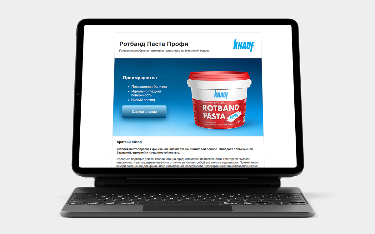 Лендинг Rotband Pasta Profi – в рамках общей кампании по выводу на рынок и продвижению новой готовой финишной шпаклёвки Knauf, я разработал сдержанный лендинг. В архиве Задача. Сделать посадочную страницу для нового продукта. Мода на лендинги набирает обороты, а фирменный стиль Knauf призывает быть сдержанным, практичным и даже прагматичным. В этой работе я старался найти компромисс и достичь баланса между эффективностью конверсионного сценария и визуальным вдохновением от образа нового продукта. Данная страница была разработана по заказу московской сбытовой дирекции КНАУФ. Она предназначена для использования в качестве шаблона официальными дилерами. © ООО «КНАУФ ГИПС» Посмотрите больше работ, которые я сделал в период работы в КНАУФ Россия, например новый сайт группы КНАУФ Россия и СНГ.