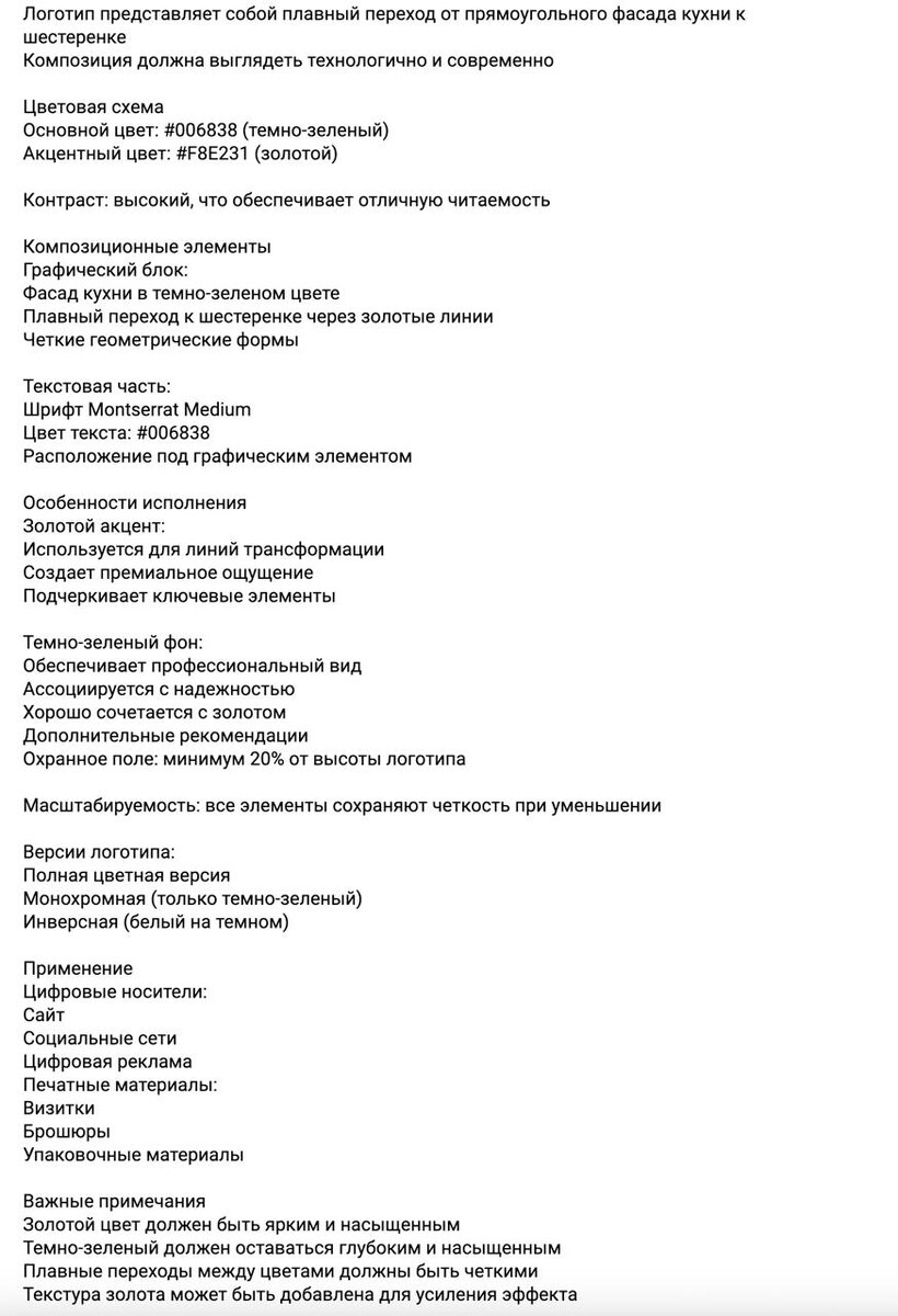 В ответ на пост Очередное ТЗ на логотип от Нейросети. На первый взгляд сразу бросаются в глаза предлагаемые ей цвета – темно-зеленый цвет фасада кухни в качестве знака, а так же темно-зеленый фон. Плюс какое-то странное описание знака – фасад кухни с плавным переходом к шестеренке через золотые линии. «Какая дурка….?»