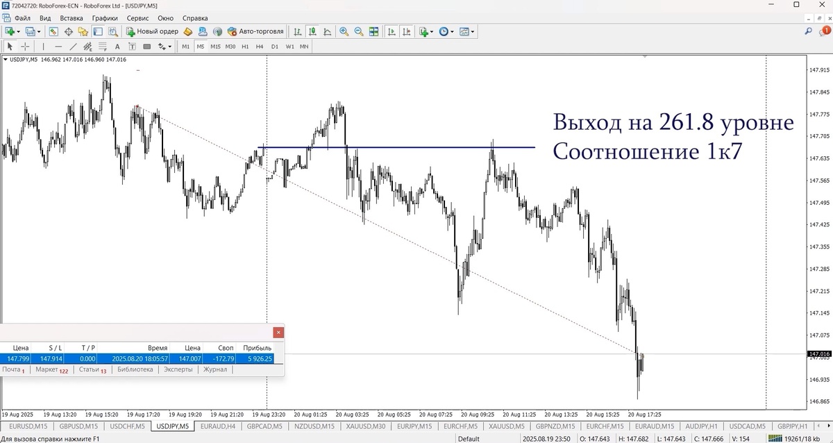В статье разберем все основные причины входа в сделку: Представлена она в следующем видео: В данной сделке учитываются уровни фибоначчи для определения входа и выхода из сделки. Для того, чтобы лучше понять данную сделку посмотрите следующее видео: Не забывайте подписываться на телеграм канал, чтобы не пропустить прибыльные сигналы в трейдинге: Первым фактором стал ложный пробой уровня с последующим образованием равных максимумов и CHOCH. Затем ищутся дальнейшие возможности для входа в коррекции после CHOCH. Как только произошла коррекция, то ситуация повторилась. Вновь образовался ложный пробой уровня и образовалась точка входа на ложном пробое. Далее дополнительное подтверждение появилось от линий фибоначчи. Три проекции имели практически равную длину, последняя пришлась на точку входа: Главными условиями выход являются следующие факторы: 1. Равенство двух проекций 2. Цена приходит в зону разворота тремя одинаковыми движениями, образуя проекцию 3. Уровень 261.8, по линиям фибоначч