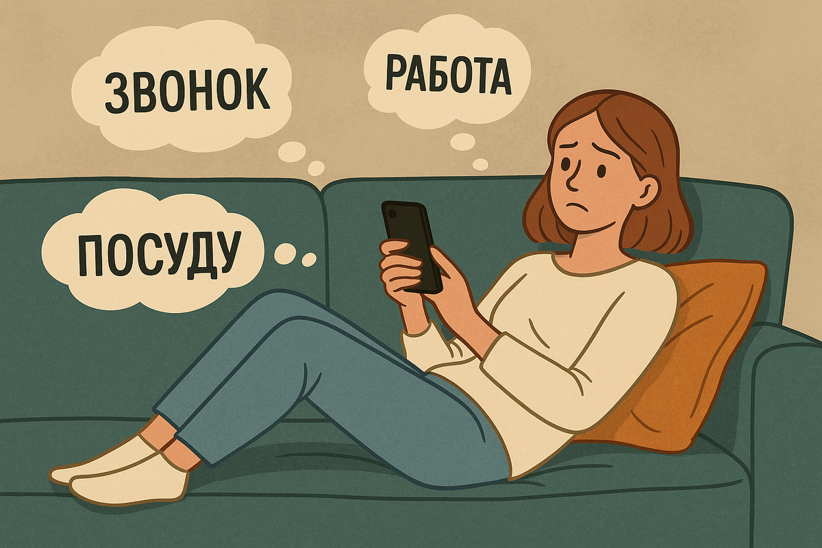 — А другие дети уже занимаются! И вот ты вырос, а внутренний учитель так и не ушёл в отпуск. Он шепчет, что отдых = лень, а лень = плохо. Хотя на деле именно в расслаблении мозг перерабатывает информацию, появляются силы и новые идеи. Телефон как враг дивана Мы живём в эпоху, когда телефон жужжит чаще, чем чайник. Даже лёжа на диване, ты автоматически тянешься к экрану. Но это не отдых, а просто смена нагрузки. Настоящий отдых — э