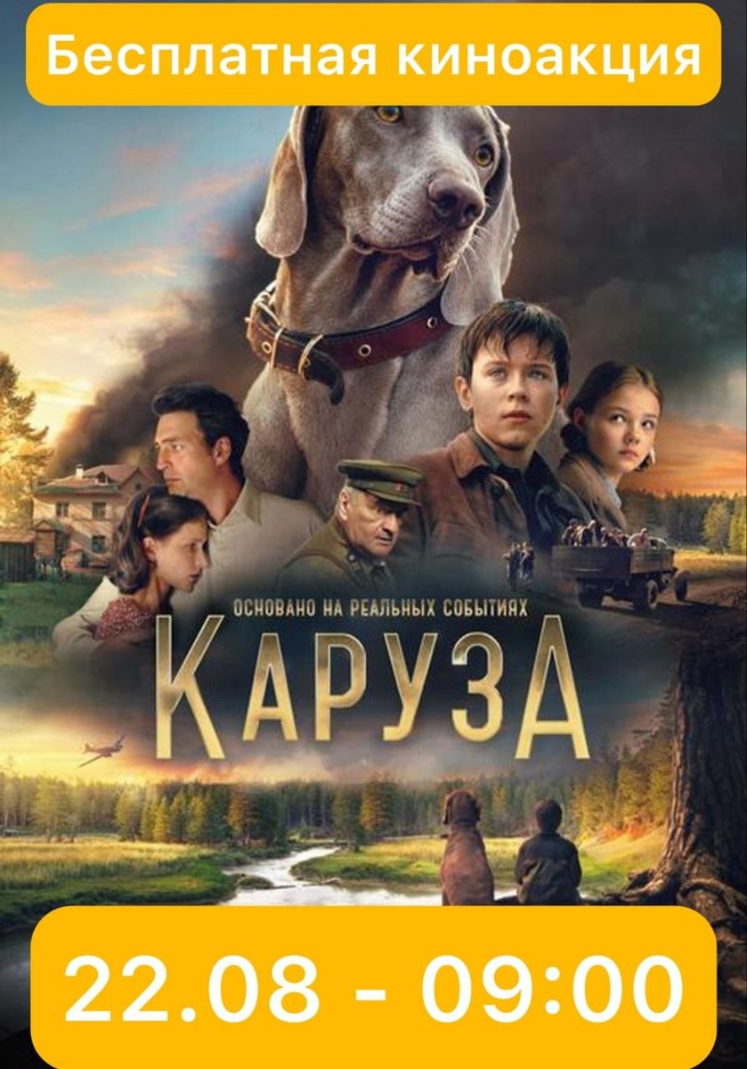 ‼БЕСПЛАТНЫЕ КИНОАКЦИИЯ «Карузе» 6+ 22.08.2025 в 09:00 1939 год. В жизни маленького Мити однажды появляется верный друг — собака по имени Каруза. Но счастье рушится, когда начинается война. Ленинград оказывается в блокаде, люди умирают от голода. Тогда Каруза, теперь уже взрослая, сильная и умная собака начинает добывать для жителей еду. Воодушевленный её смелостью, Митя решает помочь: вместе они смогут найти больше. Но однажды во время опасной вылазки их обнаруживают немцы.