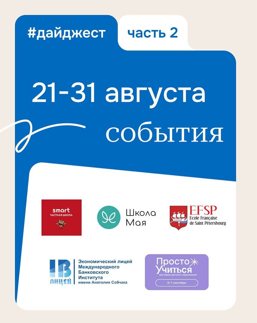 Продолжаем рассказывать вам о мероприятиях образовательных проектов Петербурга: • 26 августа День открытых дверей в Частной школе Smart Приморский район https://vk.cc/cOGKNq • 26 августа День Открытых Дверей во Французской школе Санкт-Петербурга EFSP Адмиралтейский район https://vk.cc/cOGKZs • 26 августа День открытых дверей в начальной Школе Мая Петроградский район https://vk.cc/cOMHVI • 27 августа День открытых дверей в Экономическом лицее МБИ Адмиралтейский район https://vk.cc/cOGLkB • 6-7 сентября Фестиваль детского образования «Просто Учиться» Севкабель Порт https://vk.cc/cO4oUE Ещё больше событий и летних программ на нашем сайте в Календаре событий.