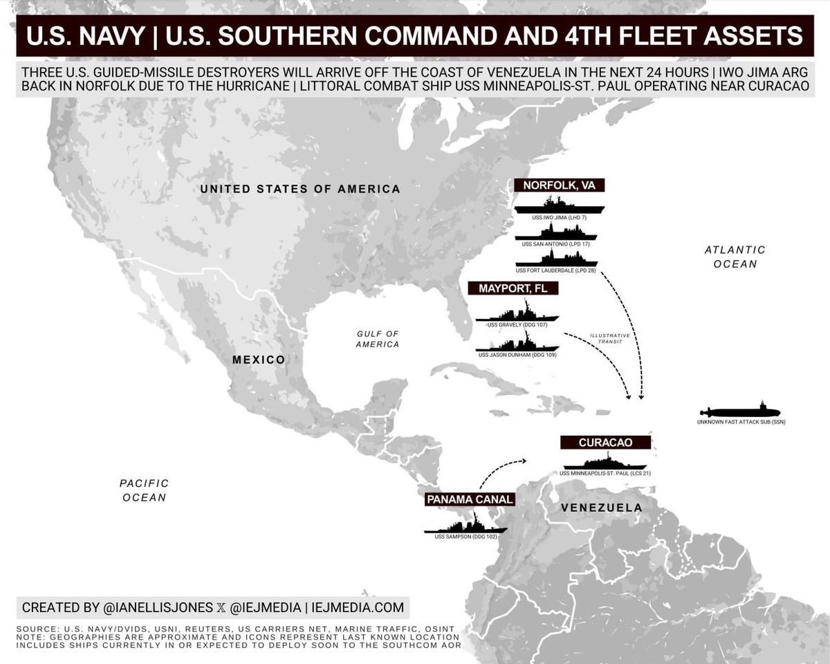 Президент США Дональд Трамп направил флотилию кораблей и другие военные ресурсы в район, расположенный вблизи территориальных вод Венесуэлы. Три ракетных эсминца класса «Арли Бёрк», подводная лодка, литоральный корабль и авианосно-десантная группа из трёх кораблей с 4000 морских пехотинцев на борту, могут в скором времени быть задействованы в военной операции против Венесуэлы, правительство которой США обвиняют в «наркотерроризме». Сообщается также об участившихся полётах американских разведывательных самолётов в регионе.