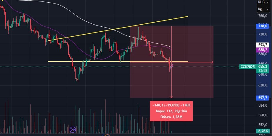 #КАКАО #ФЬЮЧЕРС 📉 Тренд нисходящий. ✔️В данный момент построил поджатие к уровню поддержки 665, пробил и подтвердил фигуру. 🔽Отработка примерно до 605, но может сходить и ниже, так как обновит последний минимум. 🤓 Какао хорошо подходит для торговли внутри дня. НЕ ИИР #теханализ #какао #фьючерсы