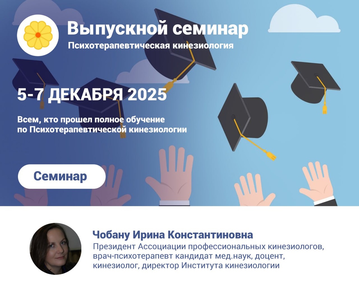 Дорогие друзья!🌿 Всех, кто прошёл полное обучение по Психотерапевтической кинезиологии приглашаем на выпускной семинар, который пройдёт с 5 по 7 декабря 2025 года💫 ✅ Этот семинар завершает полный курс обучения по Психотерапевтической кинезиологии ☝️ На этом семинаре мы обсудим особенности работы кинезиолога, подводные камни частной практики 💫 Семинар нацелен на выпуск успешных благополучных специалистов в кинезиологии Подробнее о семинаре можно узнать в личных сообщениях группы ВК или по ссылке - https://kinesioportal.ru/events/2528/8823.php