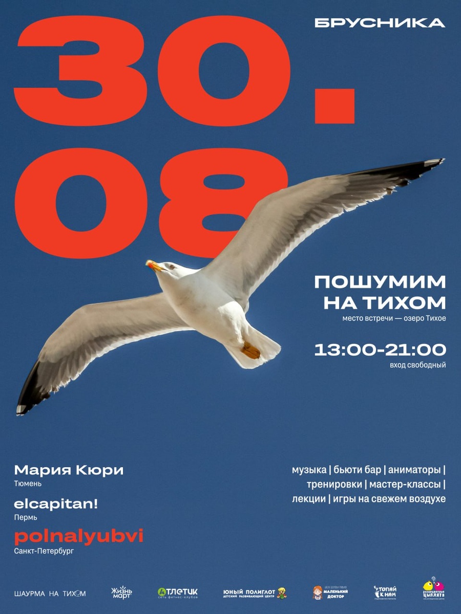 Пошумим! 30 августа компания «Брусника» приглашает на ежегодный фестиваль, который пройдет на берегах озера по ул. Муравленко, 19, которое в народе называют Тихим, уже в третий раз. «Пошумим на Тихом» – это праздник для всей семьи, в программе найдутся развлечения для каждого: тренировки, лекции, мастер-классы, игры, бьюти-бар и многое другое. Вечером гостей ждет музыкальная программа: выступят Мария Кюри, elcapitan! и polnalubvi. Завершит праздник яркий фейерверк. Это озеро «Брусника» ревитализировала в 2022–2023 годах: у водоема очистили дно, укрепили берега и создали пешеходные дорожки и зоны для отдыха. Спустя год в воду выпустили 250 кг рыбы и микроводорослей, которые очищают воду и поддерживают биоразнообразие водоема. Расписание активностей