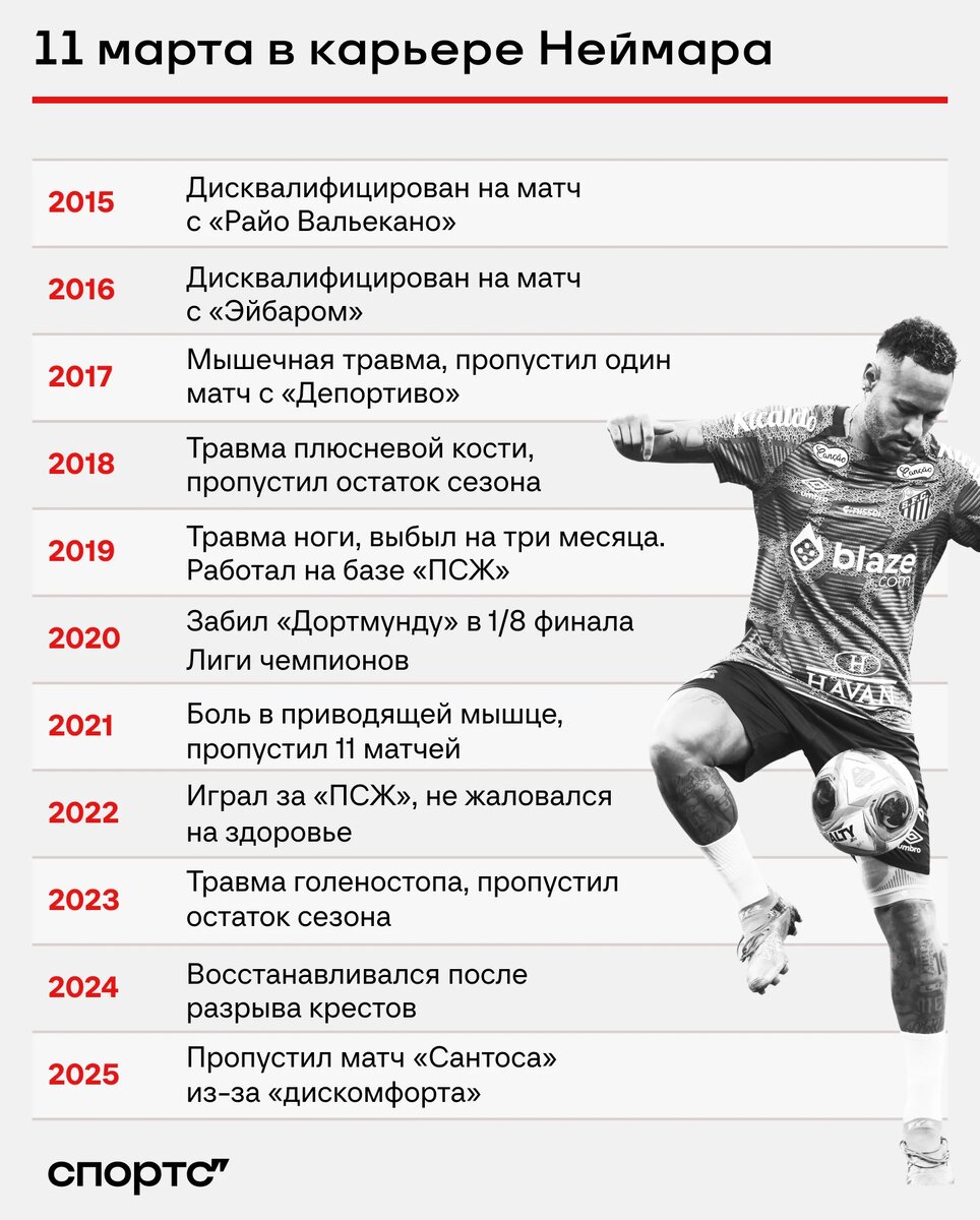 Неймар 10 лет подряд пропускает матчи перед днем рождения сестры, вечеринками и другими гуляниями. В последней игре «Сантоса» против «Васко да Гамы» Неймар получил желтую карточку и пропустит следующую встречу – 14-летие его сына попадает на дату следующей игры «Сантоса». ● Теория родилась в 2015-м, когда Неймар схватил пятую карточку в Ла Лиге против «Гранады» и получил бан на игру с «Райо». «Барселона» разрешила игроку на несколько дней слетать в Бразилию. ● В 2016-м все повторилось. Ней увидел пятую желтую в игре с «Райо» и вскоре уже был в самолете – опять с разрешения «Барселоны». ● В марте 2017-го Неймар еще играл за «Барсу» и получил мышечное повреждение в суперматче 1/8 финала Лиги чемпионов с «ПСЖ» (те самые 6:1). Выбыл всего на неделю – с 9 по 16 марта, но все равно рванул домой. ● После перехода в «ПСЖ» традиция продолжилась. В конце февраля 2018-го Неймар схватился за лодыжку в матче с «Марселем» и вылетел до ЧМ в России. Через пару недель он обнимал сестру дома. Но тогда б