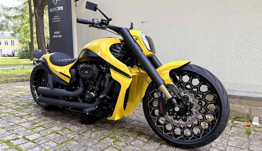 На автофестивале, который прошёл в подмосковной усадьбе Архангельское, показали новый российский мотоцикл Box39 Giotto Altre. Московская компания Box39, созданная Владом Беляковым, начинала с изготовления «кастомных» мотоциклов по индивидуальным заказам. Постепенно фирма разработала несколько оригинальных моделей и получила право присваивать мотоциклам собственный VIN-код. Это по-прежнему штучное производство, но теперь у компании Box39 есть шоу-румы в Москве и Дубае, где можно приобрести байк из наличия. На автофестивале в Подмосковье показали эффектный мотоцикл Box39 Giotto Altre. Российский проект получил эффектный и выразительный дизайн. У новинки полностью оригинальная низкая и вытянутая рама, а также корпус, выполненный из стеклопластика и алюминия. Дополняют образ колёса необычного дизайна (21-дюймовое спереди и 18-дюймовое сзади). Box39 Giotto Altre оснащён двухцилиндровым мотором Harley-Davidson Milwaukee Eight мощностью около 100 л. с. и шестиступенчатой коробкой передач. Орг