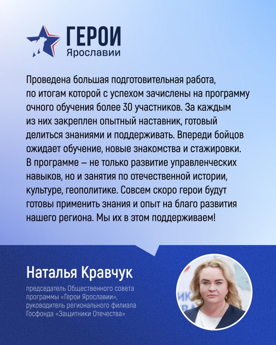 Образовательная программа «Герои Ярославии» стартовала Обучение началось для более чем 30 человек — тех, кто с честью защищал Родину на передовой. Теперь они могут применить свой опыт и силу характера на гражданской службе. Поддержку окажут наставники из управленческой команды региона. Впереди — знакомства и стажировки, которые позволят защитникам закрепиться в новой профессии. Обучение строится по индивидуальным планам, что поможет раскрыть потенциал каждого участника программы.