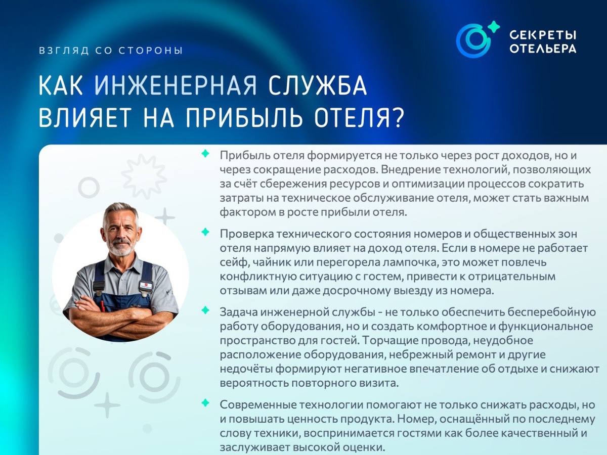 Инженерная служба - расходы или прибыль? Привычный образ инженеров в отеле - это люди, которые приходят чинить, когда что-то сломалось. Но настоящая ценность службы в другом: они должны сделать так, чтобы поломок вообще не было. По сути, это невидимые «спасатели» отеля. Их работа напрямую влияет на комфорт гостей, повторные визиты и, как следствие, прибыль. Лампочка в номере перегорела? Пустяки для инженера, но серьёзный минус в отзыве. Мы собрали взгляд со стороны: как инженерная служба может быть не только статьёй расходов, но и драйвером дохода отеля. А у вас в отеле инженеры — это «чиновники по вызову» или команда, которая реально помогает зарабатывать?