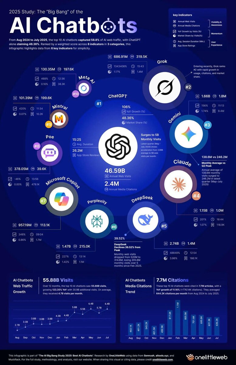 Лидеры гонки ИИ от №1 chatGPT до №10 Фесбук - смотреть по часовой стрелке по убыванию...