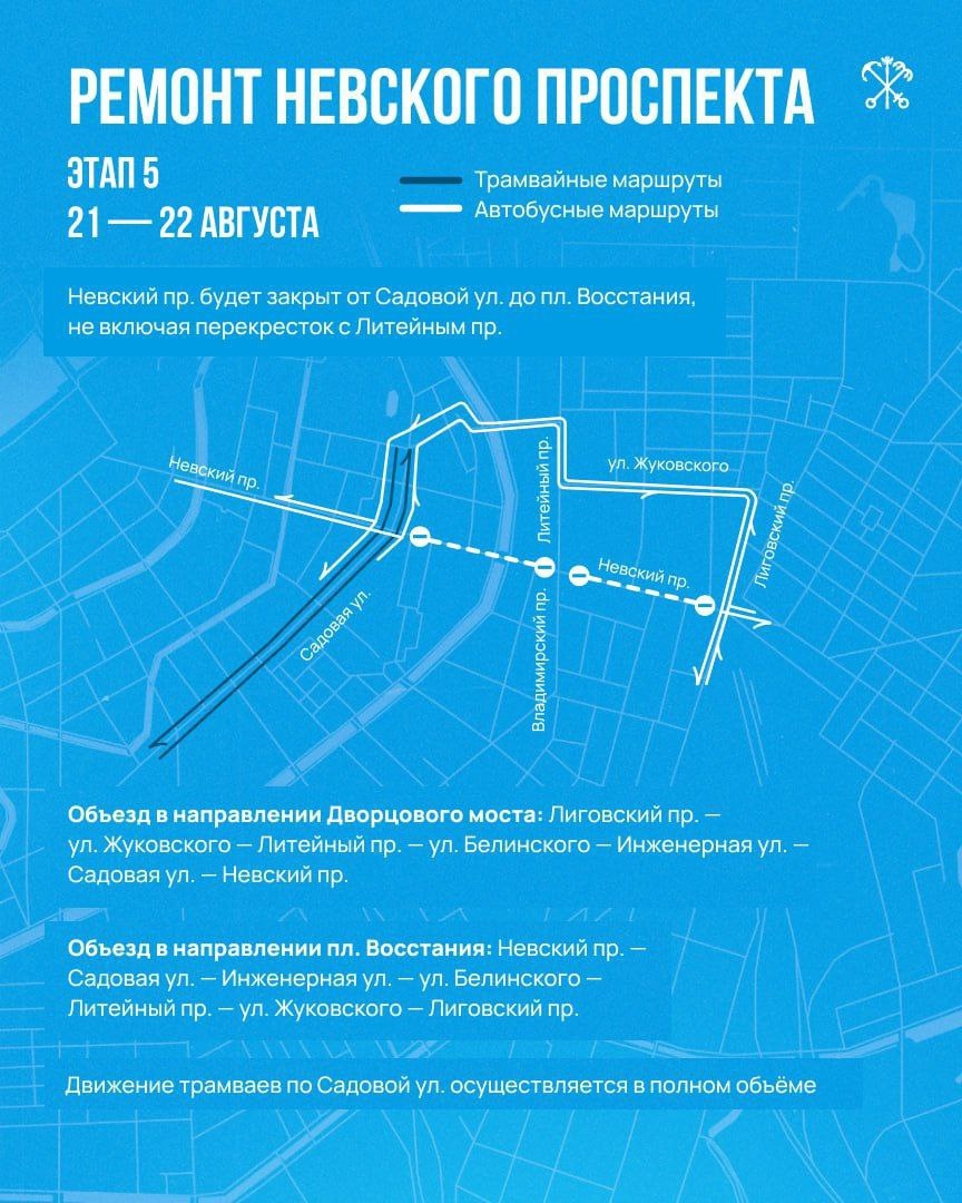 На Невском проспекте сегодня начался пятый этап ремонтных работ. В целом они выполнены на 50%. Завершены работы на интервале от Адмиралтейского проспекта до Садовой улицы. Движение транспорта по нему открыто. Участок протяженностью 1,3 км составляет почти половину главной улицы Петербурга (2,7 км). Дорожники приступили к работам на интервале от Садовой улицы до площади Восстания. В целом в ходе ремонта Невского проспекта обновят свыше 70 тысяч кв. метров дорожного покрытия. Полностью завершить работы на Невском проспекте планируется 27 августа, а открыть движение транспорта — на следующий день, 28 августа. Схема: ГАТИ Подпишись на Город+