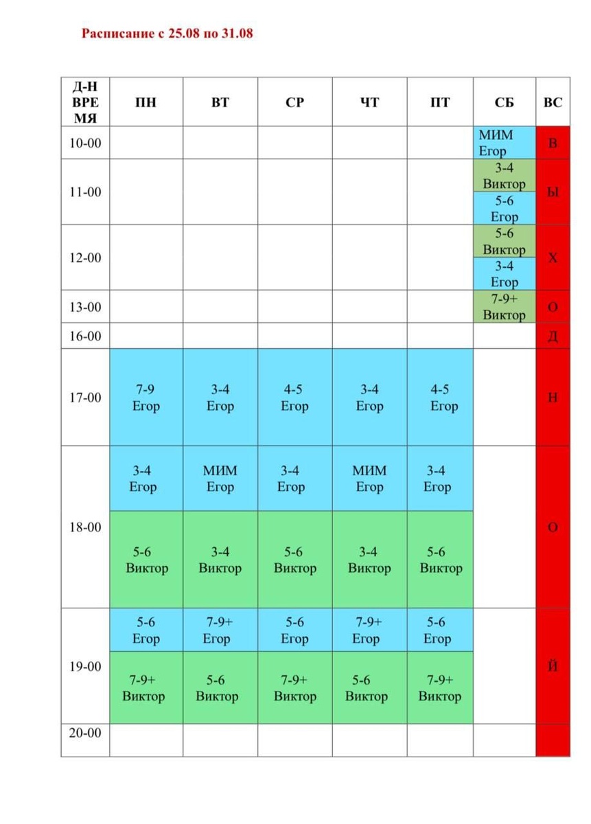 Расписание с 25.08 по 31.08