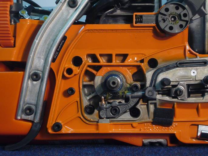 Из масляного бачка масло через фильтр поступает в масляный насос. Насос приводится в действие от вала двигателя: когда вы нажимаете на газ и цепь начинает вращаться, он начинает перекачивать масло по шлангу к шине. На шине есть небольшое отверстие — именно через него смазка попадает в паз, где движется цепь, и равномерно распределяется по звеньям. Во время работы масло подается постоянно, поэтому цепь всегда остается защищенной от перегрева и износа.