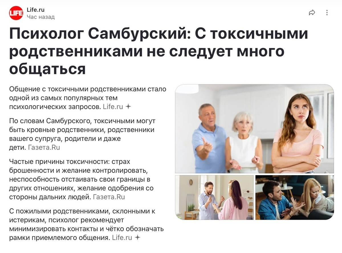 Интервью было одно, а его разобрали сразу LIFE, Газета.ру и Regions- так что я на первой странице Дзена 🧘 Психолог Станислав Самбурский: Общение с токсичными родственниками стало одной из самых популярных тем психологических запросов.
