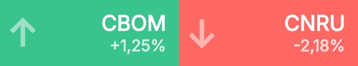 🔺 Топ-10 лидеров роста среди крупнейших акций: Московский • 8,42 ₽ • 1,25% Астра • 418 ₽ • 0,60% Банк Санкт • 389 ₽ • 0,36% Яндекс • 4 396 ₽ • 0,34% VK • 344 ₽ • 0,26% Банк ВТБ • 78,14 ₽ • 0,19% Лукойл • 6 321 ₽ • 0,14% ЕвроТранс • 127 ₽ • 0,12% ФосАгро • 7 034 ₽ • 0,09% Россети • 0,07 ₽ • 0,08% 🔻 Топ-10 лидеров падения среди крупнейших акций: Циан • 647 ₽ • -2,18% Юнипро • 1,73 ₽ • -2,04% Европлан • 638 ₽ • -1,62% ЭсЭфАй • 1 243 ₽ • -1,51% Сегежа • 1,71 ₽ • -1,38% НЛМК • 125 ₽ • -1,31% Мосэнерго • 2,21 ₽ • -1,16% Совкомфлот • 88,97 ₽ • -1,07% Мечел • 89,91 ₽ • -1,05% ПИК • 648 ₽ • -1,02%