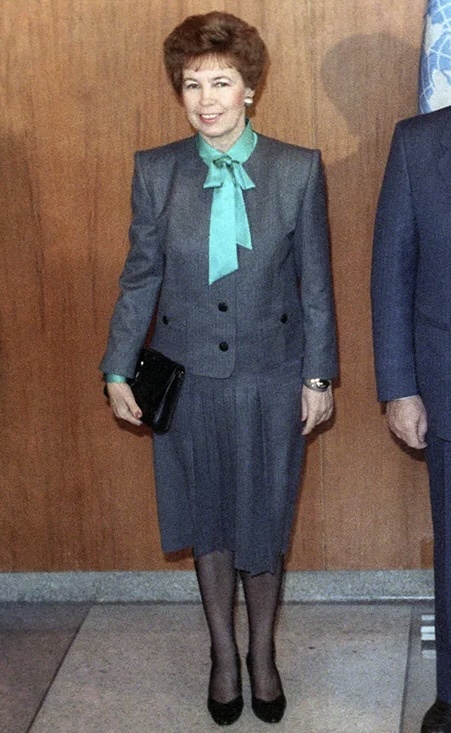 Раиса Максимовна запомнилась нам как женщина с прекрасным вкусом. Ее справедливо считали иконой стиля и уважали за умение выглядеть элегантно. За границей она достойно представляла Советский Союз. Раиса Максимовна была известна своей любовью к меху — в гардеробе первой леди СССР было немало разных шуб и меховых аксессуаров. Великолепные меховые наряды и костюмы всегда были неброских оттенков, но выполнены с большим мастерством. Одной из главных модных «фишек» Горбачевой была уместность — она всегда идеально подбирала образы под повод, вне зависимости от степени его официальности. Даже строгие официальные образы Горбачева легко делала более женственными и модными благодаря ярким акцентам. Ей также дарили много драгоценностей за границей. Однако их настоящей владелицей Горбачева не была, поскольку было принято сдавать подарки в специальный государственный фонд. Жемчужные нити Бусы из натурального жемчуга — классика на все времена. Свое первое жемчужное ожерелье первая леди приоб