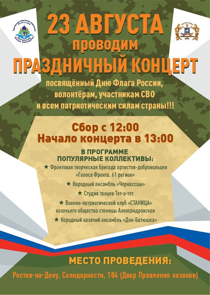 💠 В субботу, 23 августа, во дворе правления исторической казачьей станицы Александровской состоится праздничное мероприятие, посвящённое Дню Государственного флага Российской Федерации.