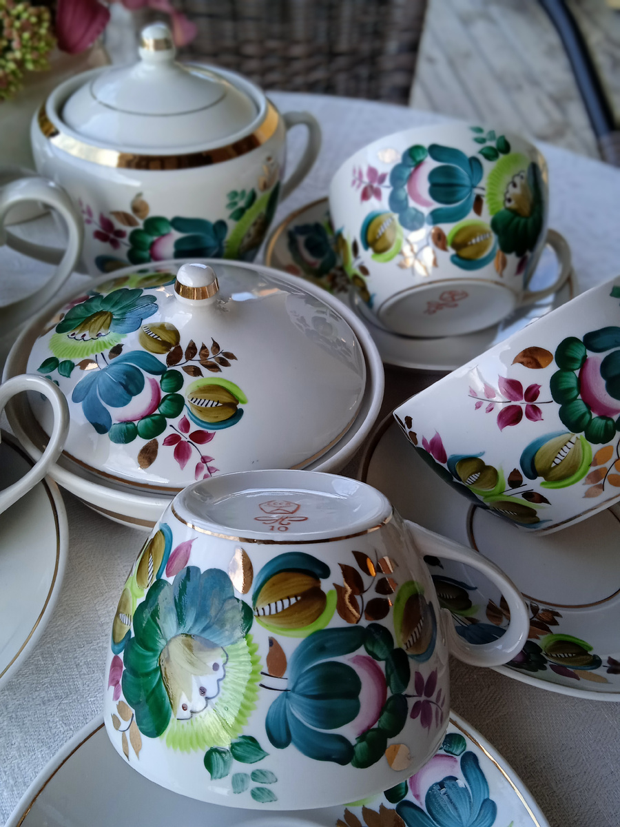Здравствуйте, друзья! С некоторых пор занимаюсь перепродажей советского винтажного фарфора на Авито. Я перекуп :). Для меня это возможность своими глазами увидеть и прикоснуться к предметам другой эпохи. Каждый раз с нетерпением жду свой заказ с Авито. Это очень волнительно. Я уже влюблена в сервиз по фотографии, но никогда не знаешь, что к тебе едет и в каком состоянии. Очень часто посуда приезжает в зачумленном состоянии, мои продавцы в основном - это люди, которым необходимо быстро расхламить квартиру, и их прекрасно понимаю. А если посуда грязная, то соответственно меня ждут сюрпризы в виде всевозможных дефектов. Но сегодня не об этом. Сегодня приехал сервиз намытый😊, целый👆и в хорошем состоянии. И вот с этого момента мне просто необходимо поделиться с неравнодушными к фарфору людьми своим восхищением и удивлением. А где я таких найду? Конечно на Дзен. Полонский фарфоровый завод 1980 - 1991 гг, красное клеймо со знаком качества СССР, позолота и самое важное - просто из