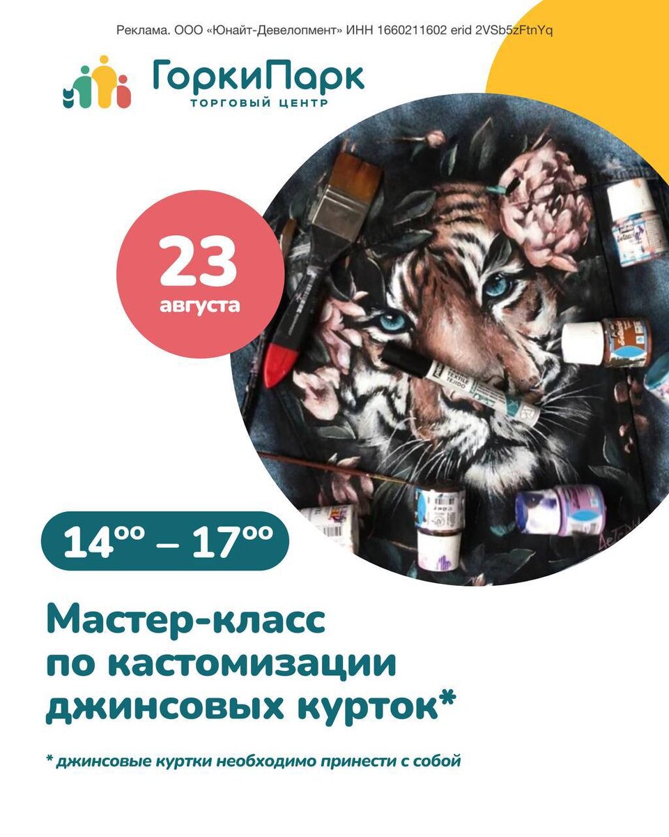 23 августа в 14:00 ТЦ «ГоркиПарк» https://t.me/gorkimall приглашает на увлекательный мастер-класс по кастомизации джинсовых курток* Каждый участник мастер-класса получит уникальную возможность окунуться в творческую атмосферу и сделать себе уникальный предмет гардероба 🎀 Место проведения: 2 этаж, зона фуд-корта Время проведения: с 14:00 до 17:00 Возрастное ограничение: 10+ Участие бесплатное, количество мест ограничено! Запись по ссылке: https://forms.yandex.ru/cloud/6899e9b7068ff0089c0e5b6a/?yqrid=35978b7d Ждем вас в торговом центре «ГоркиПарк» ❤️ *Джинсовые куртки необходимо принести с собой Больше информации в нашей группе, переходите