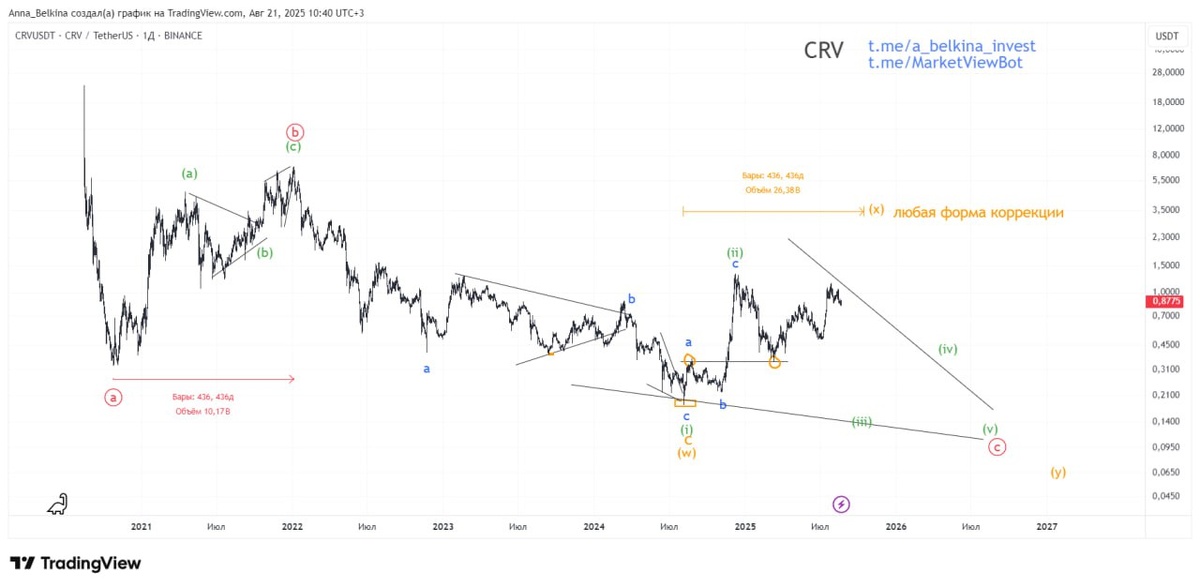 #CRV Пока без изменений. Два варианта развития событий. 1. Основной – движение в виде нисходящего одинарного зигзага, в котором волна [c] принимает вид конечной диагонали. В этой КД ставится волна (iii) of [c]. 2. Оранжевым. Движение вниз в виде двойного зигзага. Сейчас ставится промежуточная волна (х) – по продолжительности это движение еще не сравнялось с волной b of (w), поэтому промежуточный (х) еще в развитии, может встать любой формой коррекции. По завершению коррекционного отката в (х) ожидаю продолжения падения в волне (у). Не является ИИР 💪 Бот Закрытого Канала (подписаться из-за границы, пишите личным сообщением)