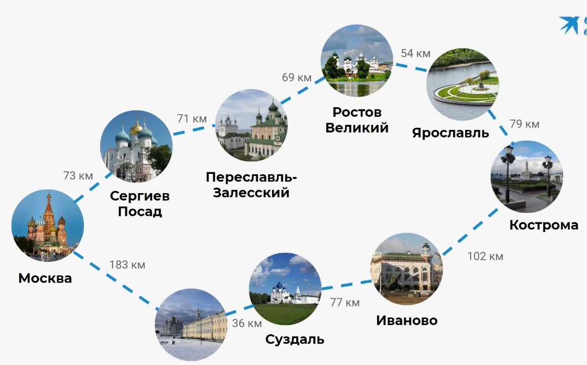 Маршрут охватывает несколько областей: Владимирскую, Ярославскую, Ивановскую, Костромскую, Московскую, Ростовскую и другие. Каждый город на этом пути — живая страница российской истории.
