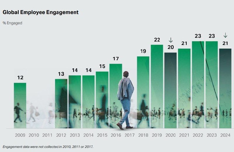 + По результатам отчета "State of the Global Workplace: 2025" от Gallup мировая вовлечённость сотрудников упала до 21% (минус 2% по