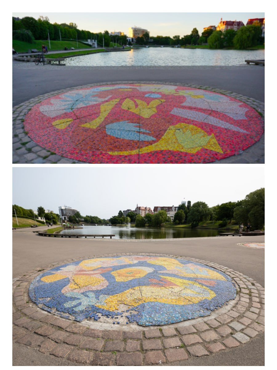 Что на Нижнем озере: нужно смотреть под ноги Четыре круглые по форме мозаики расположены со стороны улицы Шевченко. Предположительно они были созданы в 1982 году во время обустройства пруда. Тогда же были возведены Мировые часы, расположенные неподалёку. На одной из мозаик можно найти сердечко и, кажется, это единственная узнаваемая форма среди мозаичных абстракций. В остальном же, сюжеты совершенно непонятны. Но выполнены они искусно и красочно, поэтому однозначно достойны вашего внимания.