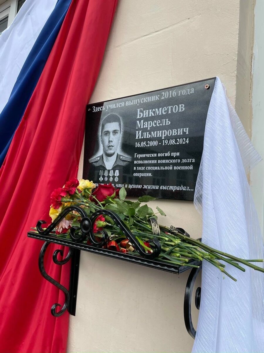 🔹В память о Герое СВО в СОШ №1 имени В.П. Полякова Сорочинска открыта мемориальная доска. 🔹Секретарь Местного отделения партии «Единая Россия» Сорочинского городского округа, глава Татьяна Мелентьева вместе с партийными активистами приняла участие в открытии мемориальной доски участнику СВО Марселю Бикметову на фасаде его родной школы. 🔹Открыли доску его родные: мама, сестры. брат и годовалая дочка Милена. Последний отпуск был предоставлен Марселю именно с рождением дочери. Папа героя сегодня на передовой и продолжает дело сына. 🔹В 2016 году парень окончил 9 классов. В 2020 году его призвали на военную службу, где он подписал контракт с Министерством обороны. Работал на вертолете, из-за чего начал терять слух. Перевелся в сухопутные войска — в артиллерию. Нёс службу в составе экипажа 2С19, был заряжающим. 🔹За время службы был награждён медалями: Жукова, за боевое отличие, за участие в специальной военной операции. Орденом Мужества награждён посмертно. 🔹В школьном музее есть
