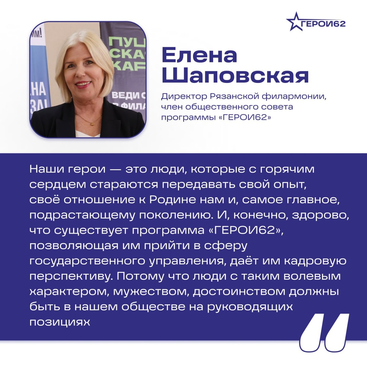 Участники специальной военной операции являются примером для подрастающего поколения, которое видит в них настоящих героев современности. Такое мнение высказала директор Рязанской филармонии, член общественного совета программы «ГЕРОИ62» Елена Шаповская. По её словам, слова о патриотизме из уст людей, прошедших фронт, обладают особой ценностью и силой, поэтому этот опыт крайне важен для передачи молодежи. Шаповская также подчеркнула необходимость содействия в карьерном росте и продвижении самих бойцов на управленческие должности. В этом контексте она назвала программу «ГЕРОИ62» крайне актуальной и востребованной. «Наши герои — это люди, которые с горячим сердцем стараются передавать свой опыт, своё отношение к Родине нам. Именно они — с их волевым характером, мужеством, достоинством — должны быть в нашем обществе на руководящих позициях», — подчеркнула Елена Шаповская.