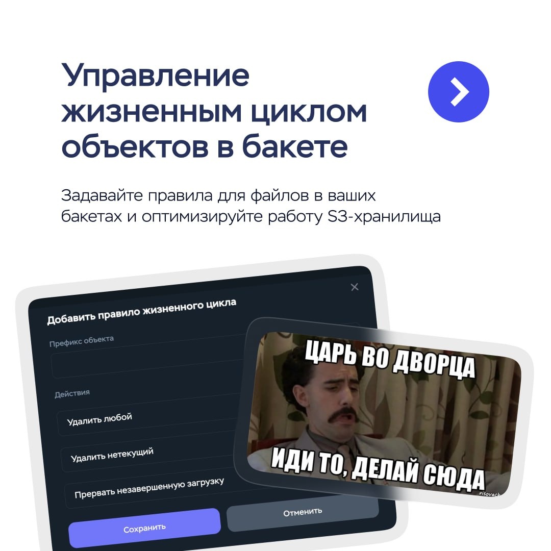 Стать полноправным королем S3 👑 В панели управления появилась новая фича — возможность задавать правила жизненного цикла для объектов в бакете. Теперь вы можете: ➖ Указать любое количество правил для одного бакета ➖ Удалять объекты через заданное время ➖ Удалять старые версии объектов, которые автоматически сохраняются в бакете (если включено версионирование) ➖ Прерывать незавершенные загрузки Для каждого правила задается дата срабатывания от момента создания объекта или начала загрузки. А пока можете поискать кликабельную корзинку 🗑, которая приведет вас в ваш новый бакет в панели. 🗑🗑🗑🗑🗑🗑 🗑🗑🗑🗑🗑🗑 🗑🗑🗑🗑🗑🗑 🗑🗑🗑🗑🗑🗑