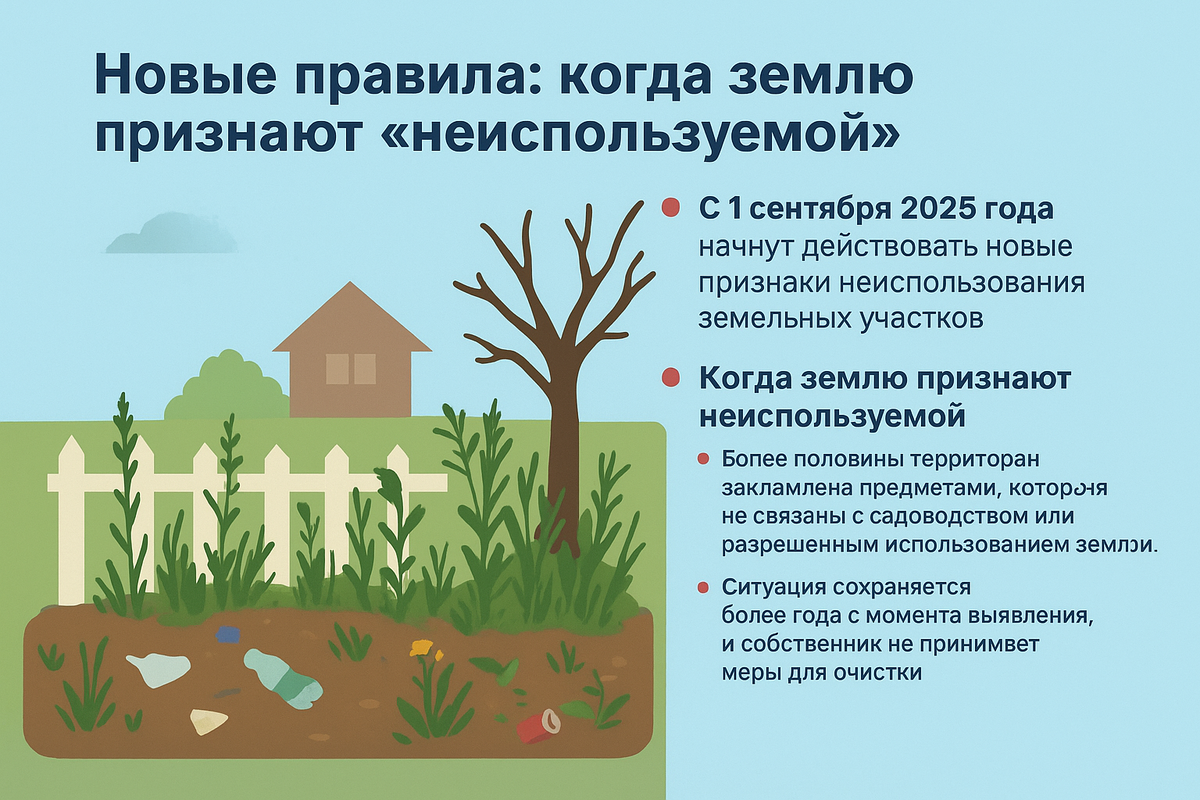 С сентября 2025 года вступят в силу новые правила для садовых и огородных участков. Теперь у государства появятся конкретные критерии, по которым землю можно признать «неиспользуемой». Всё просто: В таком случае землю посчитают неиспользуемой. Есть исключения. Критерии не применяются, если: Если участок признают заброшенным, могут начаться проблемы: от штрафов до изъятия земли.