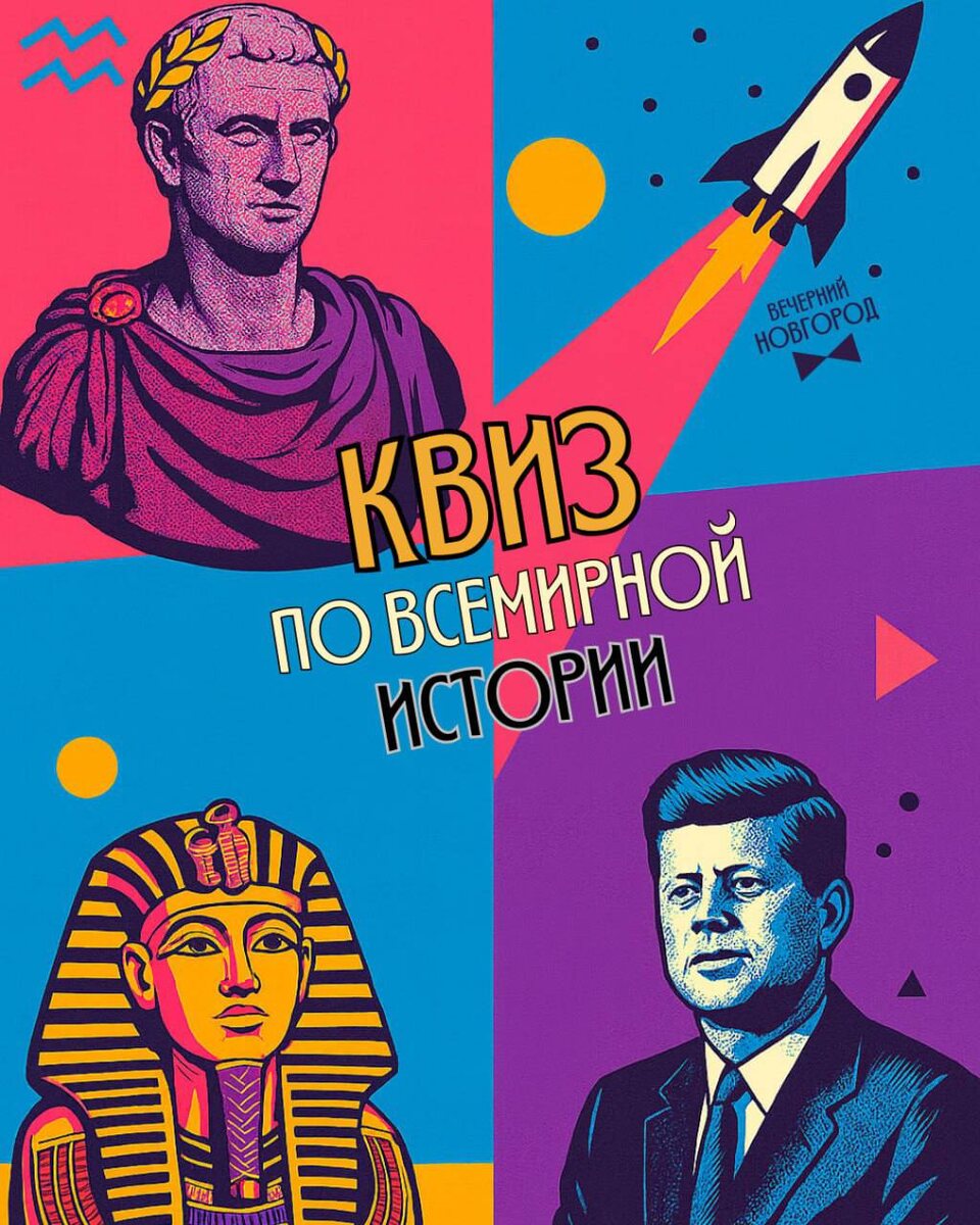 💡 Квиз по всемирной истории — отличная возможность проверить себя и узнать новое Вас ждут восемь раундов вопросов: от Древнего Египта до освоения космоса, от Юлия Цезаря до Джона Кеннеди. Это будет увлекательно, познавательно и с азартом командной игры. Квиз проходит совместно со StandUP на территории Эколофта. Приходите сами и зовите друзей! 🗓 27 августа в 19:30 📍 Ул. Большая Санкт-Петербургская, 64, 3 этаж🎟 300 рублей с человека ✏️ Запись по ссылке