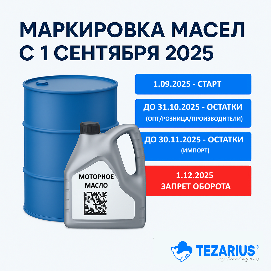 С 1 сентября 2025 года в России вводится обязательная маркировка моторных масел. Рассказываем коротко и по делу: что изменится, как работать с маслом "на розлив", где брать коды — и как программа Tezarius.ru упростит вам переход к новым правилам. ⏳ Сроки промаркировки остатков: ‼️ С 1 декабря 2025 года оборот немаркированных масел запрещён. 📌 Итог: