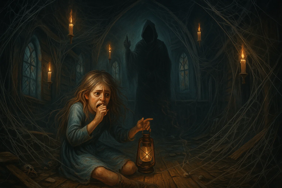 В отчаянии я бросилась бежать, натыкаясь на стены, запутываясь в паутине, которая липла к лицу и рукам. Я чувствовала, как по мне ползают пауки — маленькие, быстрые, вызывающие мурашки по всему телу. В какой-то момент я споткнулась, и моя нога застряла между досок в полу. Я дёргалась, пытаясь освободиться, но доски держали крепко. Сидя на холодном полу, я вдруг заметила в углу тёмный силуэт. Это был человек — невероятно высокий, в длинном плаще с капюшоном, скрывающим лицо. Он стоял неподвижно, но его рука медленно поднималась, крестя меня. Движение было таким плавным, почти гипнотическим, что я на секунду замерла, не в силах отвести взгляд.