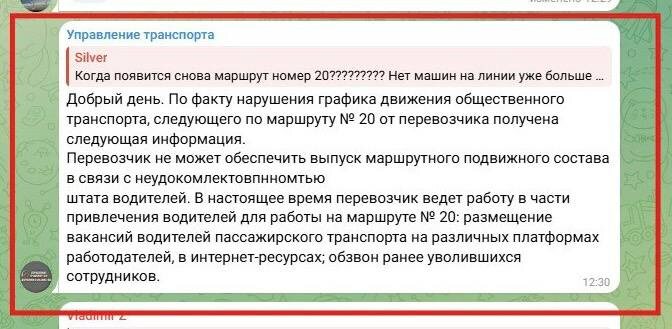 Более месяца маршрут №20 отсутствует на линии. При этом Управление транспорта дезинформирует граждан, утверждая, что разбирается с перевозчиком в суде. Когда мы уточнили у Управления транспорта, какие меры принимаются для восстановления движения маршрута №20, они ответили, что судятся с перевозчиком. Мы запросили информацию по арбитражным искам, но так и не нашли подтверждений. Тогда направили официальное письмо, и в ответе Управление подтвердило, что действительно подавали иск в суд, но не по маршруту №20. Получается, граждан снова дезинформируют. Перейдём к их официальному ответу: По факту нарушения расписания движения общественного транспорта по муниципальному маршруту №20 сообщаю следующее. - 27.10.2024 Управление транспорта и дорожного хозяйства (УТиДХ) направило Председателю Простого товарищества «Автолайн» информацию об устранении нарушения Закона №3931-КЗ, выразившегося в несоблюдении расписания по маршруту №20. Нарушение было устранено в добровольном порядке. - 29.05.2025