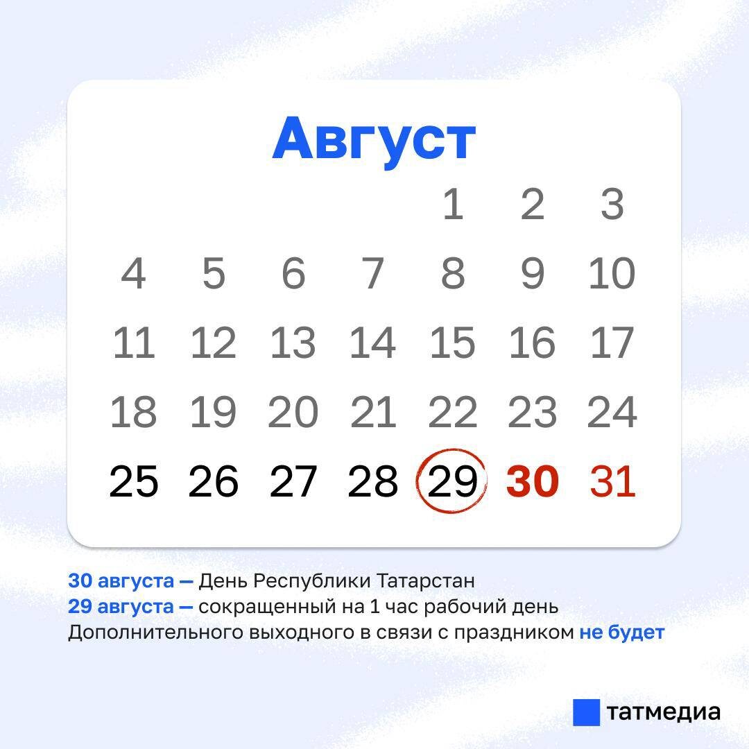 В ответ на пост 🇷🇺📆 У татарстанцев на следующей неделе будет сокращенный рабочий день Причиной тому послужило празднование Дня Республики Татарстан, который будет отмечаться 30 августа. Но дополнительного выходного в связи с празднованием Дня Республики у жителей РТ не будет, поскольку праздничный день приходится на субботу, а в случае с республиканскими праздниками переноса дополнительного выходного нет. Всего в августе татарстанцы, работающие на пятидневке, будут трудиться 21 день, а 10 станут выходными. @tatmediaofficial | Все каналы Татмедиа