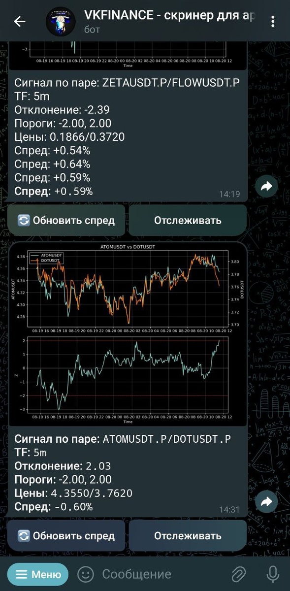⚡️ В первой версии скринера VKFINANCE появилась новая функция — кнопка обновления спредового значения. Зачем она нужна? 👉 Если сигнал пришёл 5–10 минут назад, вы можете обновить данные и понять, актуален ли он. — Если спред уменьшился → сделку открывать не стоит. — Если спред увеличился → можно рассмотреть пару для работы. — Если спред не изменился → значит, ситуация осталась такой же, как в момент сигнала. Удобно, быстро и наглядно 👌 vkfinance.ru