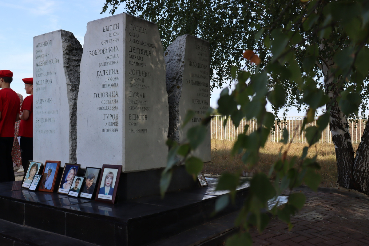 В августе 2005 года на месте катастрофы был открыт мемориал в память о жертвах теракта. На алеее высадили в форме креста 43 дерева. Дубы символизировали мужчин, березы – женщин. В основании креста установили гранитный памятник из четырех колонн, на которых выбиты имена погибших.