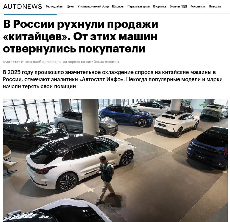 За что РАР-овцы ни возьмутся - всё падает и рушится. Только они со скрипом перезапустили новость о требовании оснащать импортируемые в Россию автомобили обязательными FM-приемниками и предустанавливать на них т.н. российский индустриальный радиоплеер, как вдруг... Любовь россиян к Китаю довольно быстро остыла. Пишут, что в России рухнули продажи китайских автомобилей. Совокупно падение спроса по отношению к прошлому году превысило 30%. В июле 2025 года в России было продано на 18% меньше, чем за аналогичный период годом ранее. По итогам первых семи месяцев реализовано на 27% меньше, чем в 2024-м . На существенное снижение интереса россиян к китайским автомобилям обратили внимание аналитики «Автостат Инфо». Ну, допустим, докопались РАР-овцы до Минпромторга, ну будет в китайцах установлен FM и предустановлен, извините за выражение, Индустриальный Радиоплейер. Но это ж будет сделано не за счёт РАР-овец, платить за эти фантазии будет покупатель автомобиля, причём, лишние 50к, его скоро