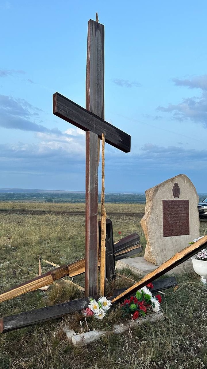 Вот так вандалы разнесли место Салмышского боя под Оренбургом. Здесь в апреле 1919 года состоялось самое кровопролитное сражение Гражданской войны в Оренбуржье. А в 2014 году был установлен большой крест и камень с табличкой «Сей крест и камень установлены на месте Салмышского боя в назидание потомкам и в память о жертвах братоубийственной Гражданской войны 1917-1922 годов»
