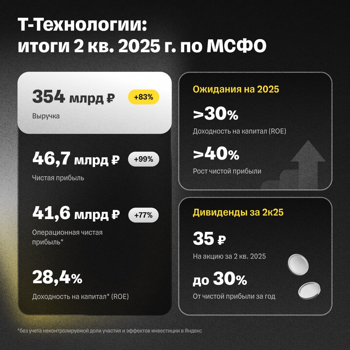 📊 Основные финансовые показатели «Т-Технологии» (II квартал 2025): - Выручка: 354 млрд руб. — рост на 83% г/г - Чистая прибыль: 46,7 млрд руб. — рост в 2 раза г/г - Операционная чистая прибыль: 41,6 млрд руб. — рост на 77% г/г - Рентабельность капитала (ROE): 28,4% - Число клиентов: 51,4 млн — +16% г/г - Активные клиенты: 33,5 млн — +11% г/г 💼 Долговая нагрузка и ключевые финансовые показатели: - Объем кредитов (за вычетом резервов): 2,8 трлн руб. — рост в 2,3 раза г/г - Процентные расходы: 136 млрд руб. — рост в 2,6 раза г/г - Чистый процентный доход: 123 млрд руб. — рост на 59% г/г - Стоимость фондирования увеличилась с 9,7% до 13,4% - Доля неработающих кредитов снизилась до 6,5% (с 9,3% год назад) - Коэффициент достаточности капитала первого уровня: 14% (рост за год) 💰 Денежные потоки и операционная активность: - Операционная чистая прибыль увеличилась на 77% при значительном росте клиентской базы и активов - Совокупные операционные расходы выросли на 47%, что связано с инвестици